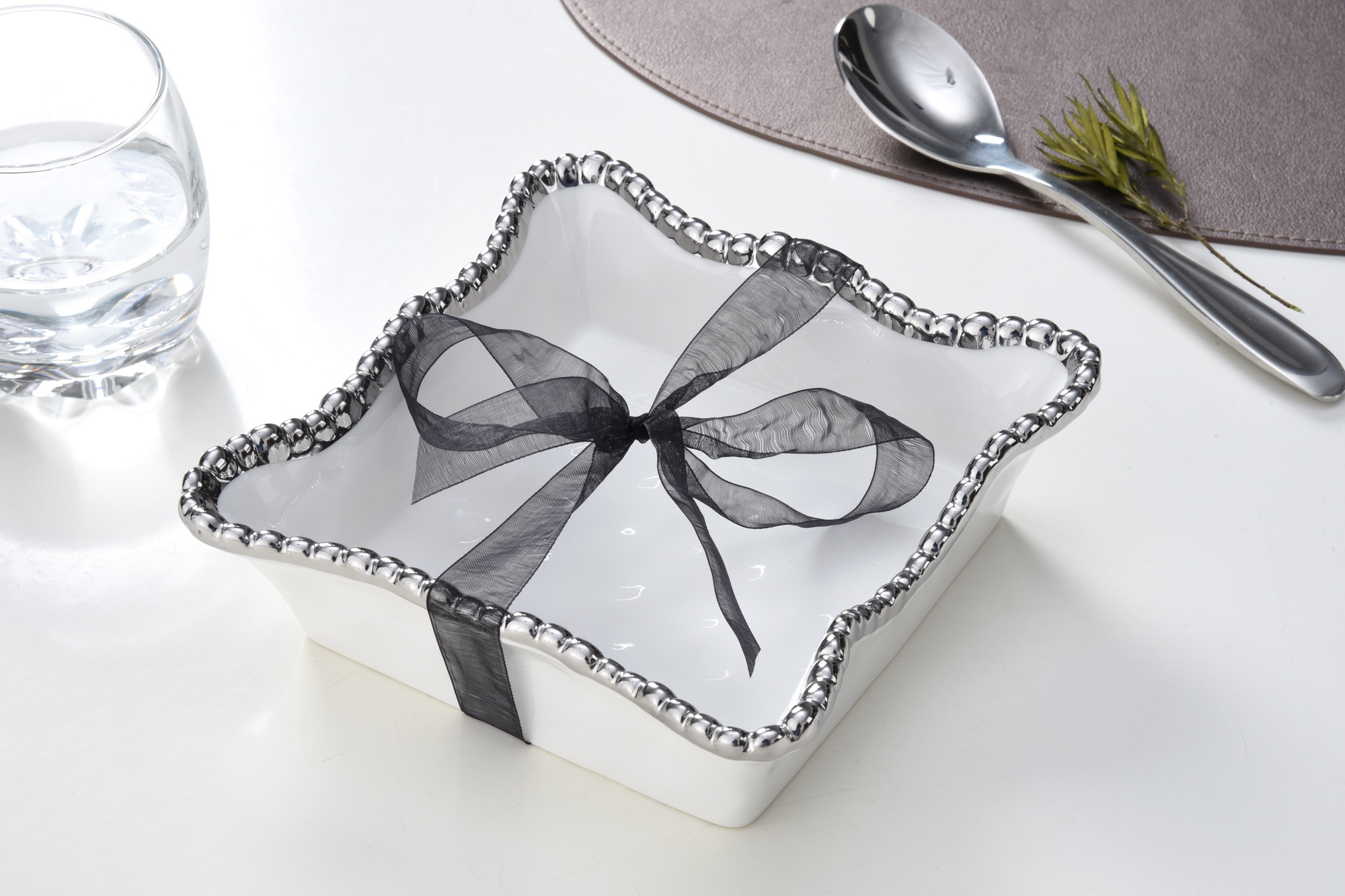 Servilletero blanco orilla plateada de porcelana 7″ x 7″ x 2″