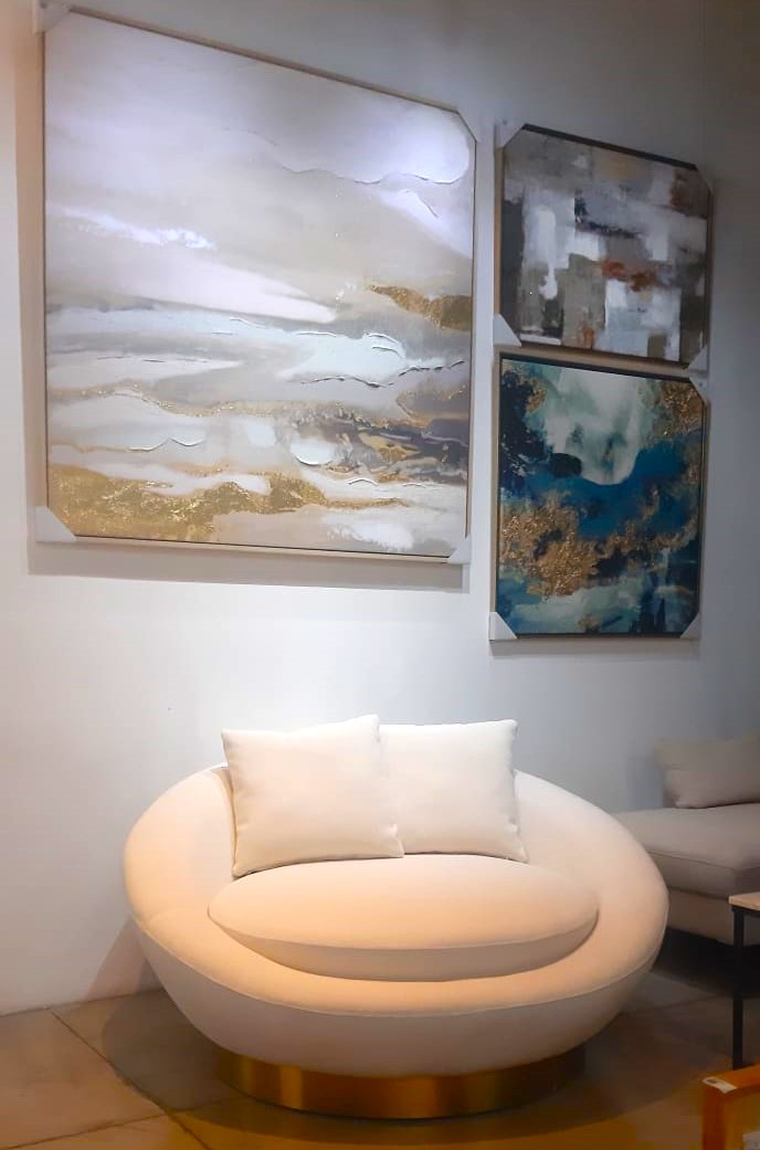 Sofa individual con 2 cojines cuadrados base dorada tela boucle blanco 147 x 147 x 74 mts